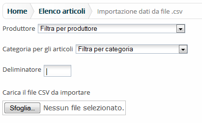 Cliccando su questa voce di menù, raggiungibile dal percorso Home => Articoli => importa articoli, si accede al modulo per importare con un file con estensione csv gli articoli in PortAlGas.